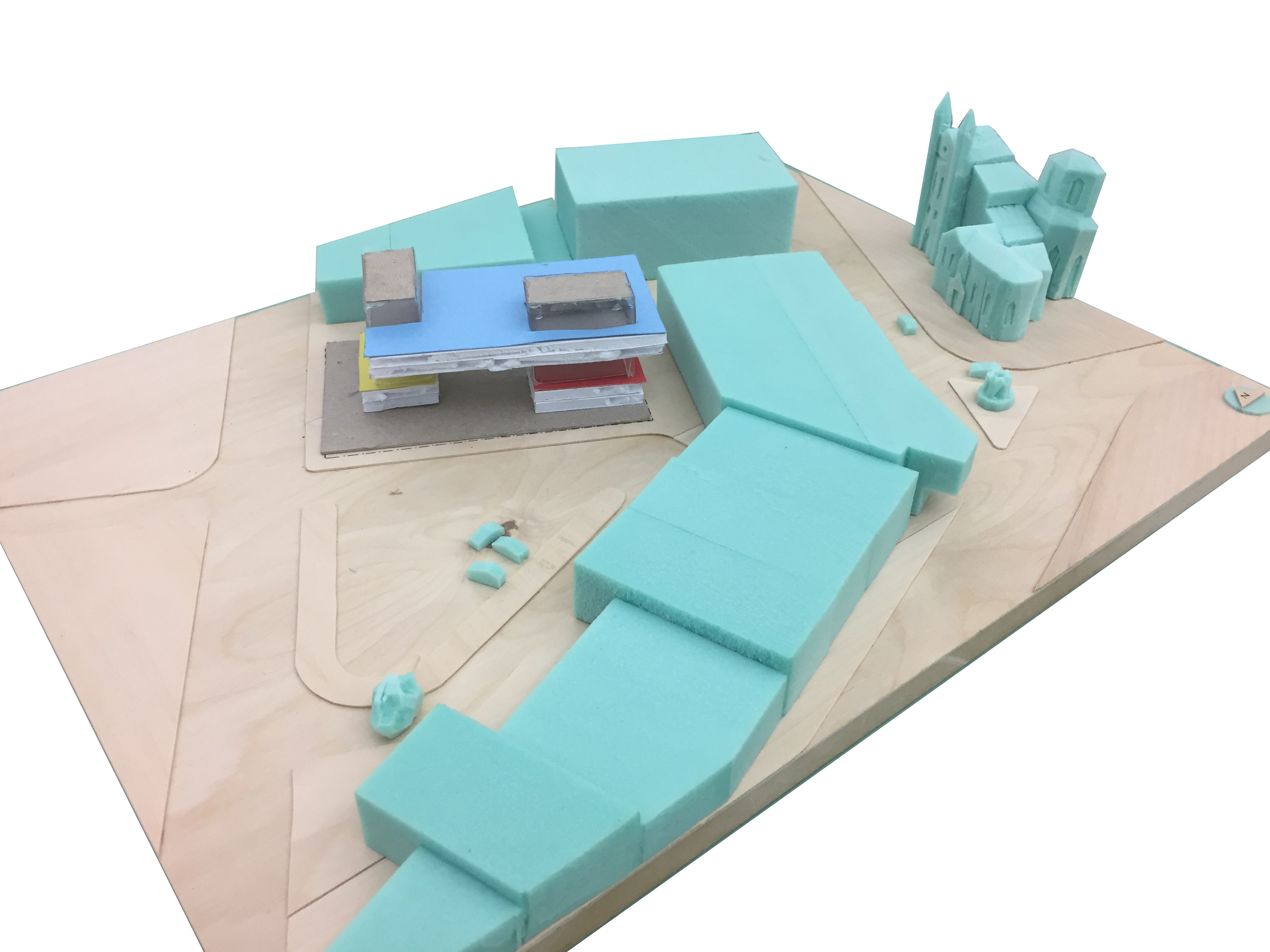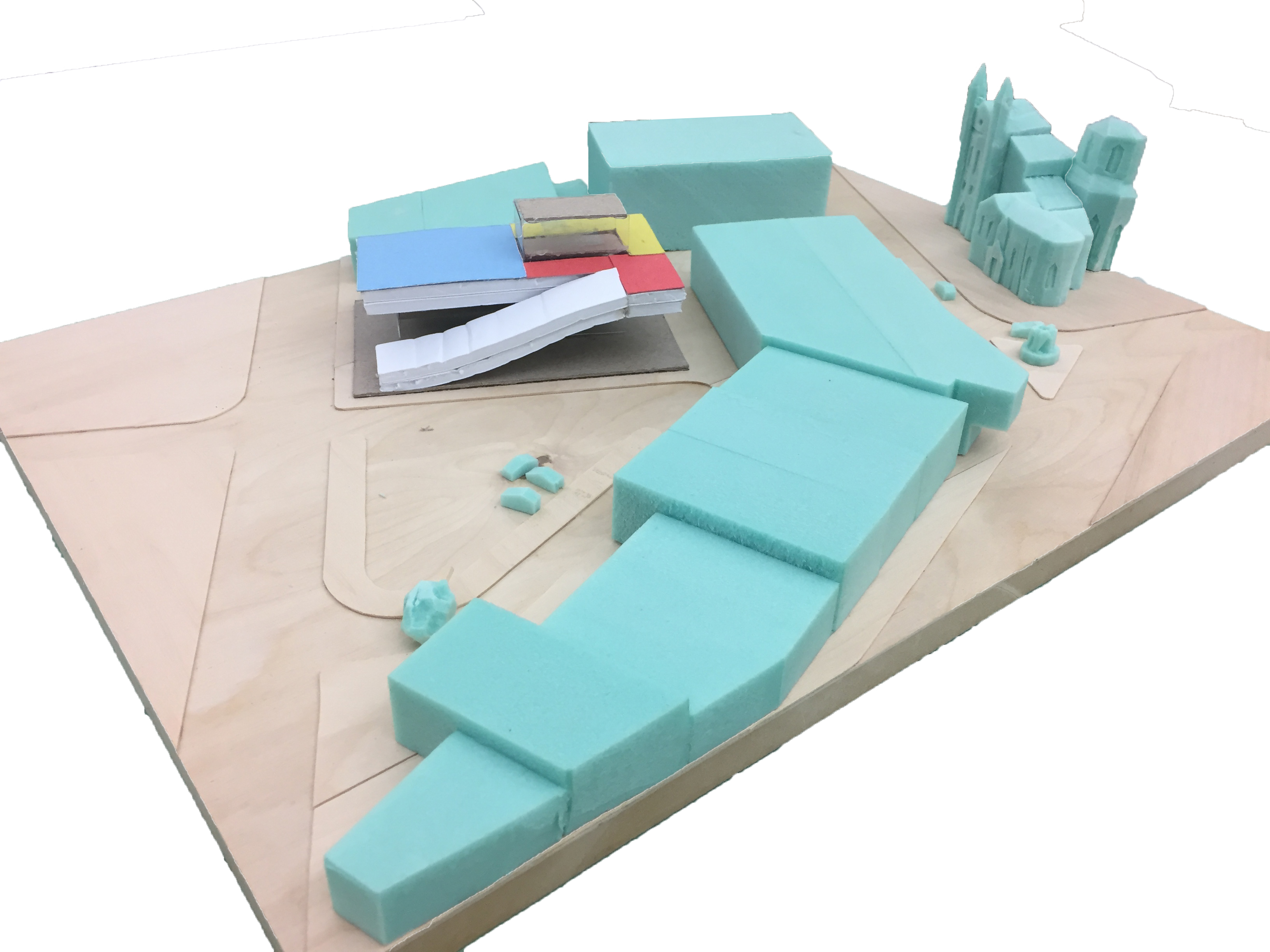 Using quick study models, I deveoped an overall building form that would facilitate distinct, mostly-separate functions, while creating moments of blending and transparency.